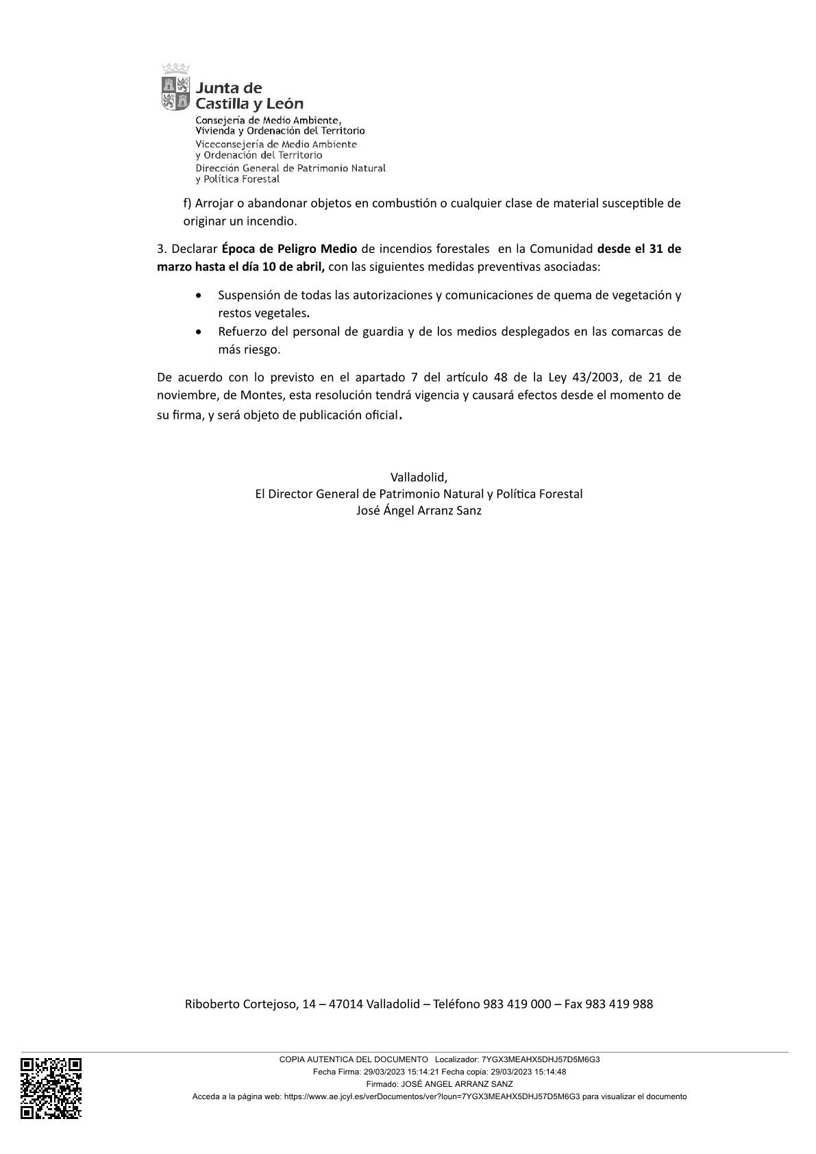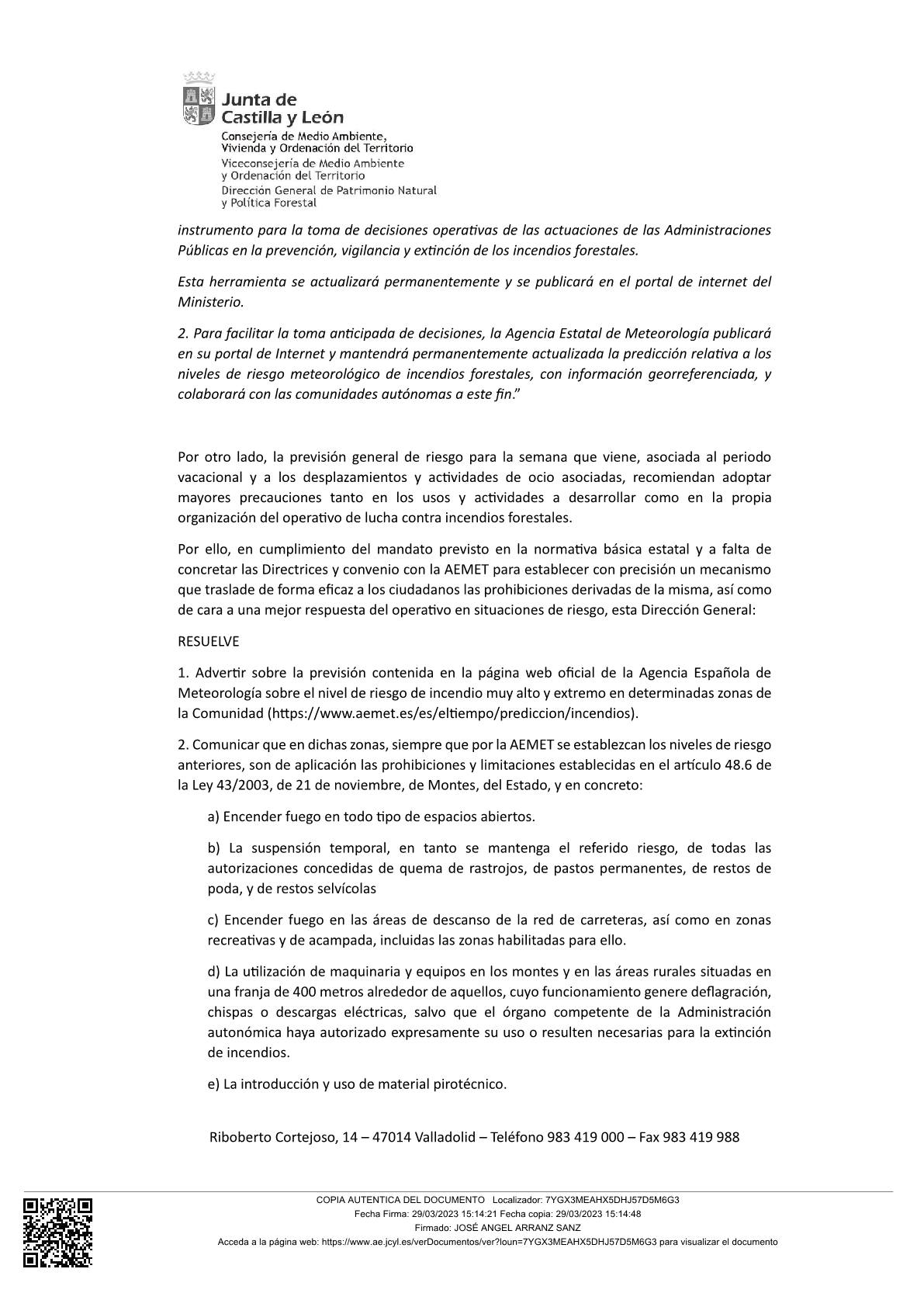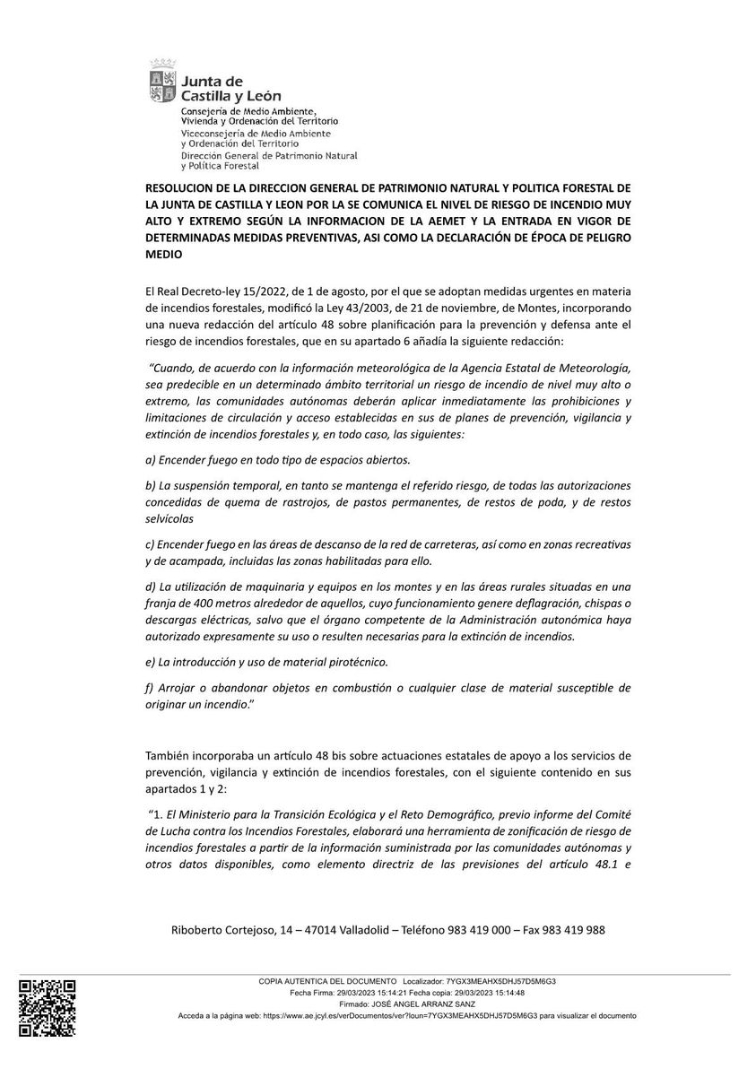 RESOLUCION DE LA DIRECCION GENERAL DE PATRIMONIO NATURAL Y POLITICA FORESTAL DE LA JUNTA DE CASTILLA Y LEON POR LA SE COMUNICA EL NIVEL DE RIESGO DE INCENDIO MUY